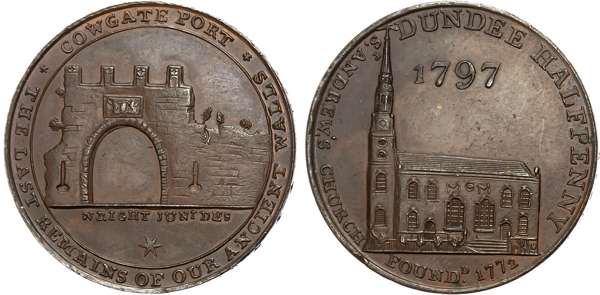 Angus . Dundee , John Pilmer (grocer), Wright’s Halfpenny 1797, Glassworks and cone, rev, Facade of town hall, edge PAYABLE BY JOHN PILMERCHURCH LANE XX, 29mm/10.69gm. (DH 17). Dundee , Alexander Swap, (cloth merchant) Halfpenny 1797, St. Andrew’s church, rev . Cowgate Port, edge , PAYABLE AT THE WAREHOUSE OF ALEXR SWAP & CO*++, 28.5mm/11.45gm. (DH 21), Both Extremely Fine or better and toned, first with large obv. edge die break as usual, second lightly bronzed. [2]
