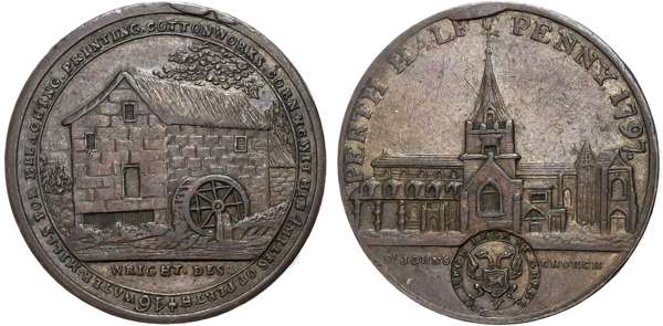 Perths. Perth , John Ferrier Halfpenny, 1797, St John’s Church, town arms in a cartouche below, rev. Watermill and tree …