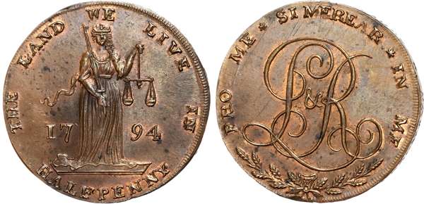 Co. Dub. Dublin , Alexander Cornwell Halfpenny 1795, Bust of Cornwell, rev. FOR TRADE ON SHIELD , edge plain. 29.3mm/9.79gm. (DH 307). Talbort Fyan (grocer) Halfpenny 1794, Justice standing, rev. brandy bottle and sugar loaf, edge HALFPENNY PAYABLE AT DUBLIN CORK OR DERRY. 30.6mm/10.07gm. (DH 308). Lloyd & Ridley (button maker and woollen draper, respectively) Halfpenny 1794, Justice standing, rev. L&R cypher, edge PAYABLE IN DUBLIN OR HAROLDS CROSS BUTTON FACTORY. 28.5mm/10.42gm. (DH 338). All Good Extremely Fine, first with marvellous iridescence, second with much original colour and lustre, last with nearly as much. Superb group. [3]