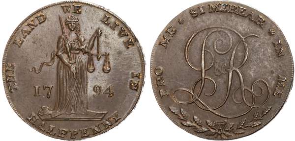 Co. Dub . D ublin , Lloyd & Ridley (button maker and woollen draper, respectively) Halfpenny 1794, Justice standing facing, rev , LR cypher, edge PAYABLE IN DUBLIN OR HAROLDS CROSS BUTTON FACTORY *, 28.25mm/9.97gm. (DH 338), good Extremely Fine, handsome almost iridescent toning with trace of lustre.