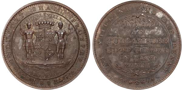 Kings Co. Tullamoore, Charles Bury, viscount Charleville (estate owner) Thirteen Pence 1802, Arms and supporters of Charleville, rev. 6-line legend, edge plain, 36.25mm/26.68gm. (DH 1). UNC, bronzed, a little dirty but with underlying lustre, rare.