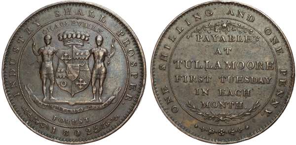 Kings Co. Tullamoore, Charles Bury, viscount Charleville (estate owner) Thirteen Pence 1802, Arms and supporters of Charleville, rev. 6-line legend, edge plain, 36mm/21.56gm. (DH 1). Good Very Fine, toned , rare.