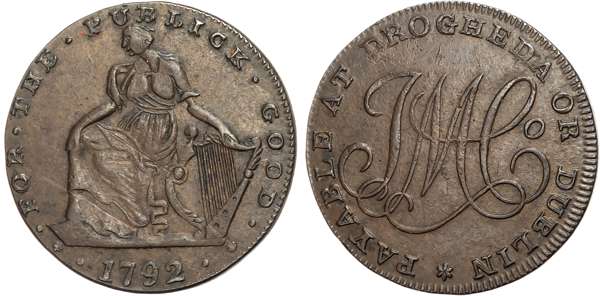 Co. Louth . Drogheda , Irish Mining Company Halfpenny 1792, Hibernia seated left, rev. IMCo cypher, edge plain 26.25mm/6 …