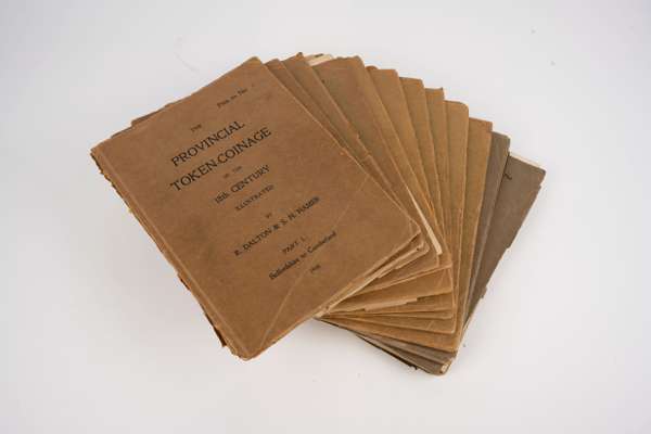 Dalton, R., and Hamer, S.H., The Provincial Token-Coinage of the 18th Century [London, 1910-18], Parts I-XIV [Bedfordshire to Addenda], complete (Manville 697) (14) plus Brief Particulars respecting the Eighteenth Century Tokens Connected with the County of Middlesex, undated but in the same format as previous (1). An original set in pamphlet form for binding, some brown covers loose and spines a bit worn but plates in good condition for binding. [15