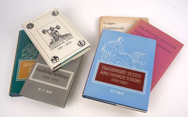 Bell, R.C., Commercial Coins 1787-1804, Newcastle-upon-Tyne, 1963, 319pp, illustrations in text, dj (Manville 1098); Bell, R. C, Copper Commercial Coins 1811-1819, Newcastle-upon-Tyne 1964 238 pp, illustrations in text, Bell, R.C., Tradesmen’s Tickets and Private Tokens, 1785-1819, Newcastle-upon-Tyne, 1966, xii + 315pp, illustrations in text, dj (Manville 1131); Bell, R.C., Specious Tokens and those struck for General Circulation, 1784-1804, Newcastle upon Tyne, 1968, xvii + 257pp, illustrations in text, dj (Manville 1165); Bell, R.C., Unofficial Farthings 1820-1870, London, 1975, 248pp, illustrations in text, dj (Manville 1305); Bell, R.C., The Building Medalets of Kempson and Skidmore, 1796-1797, Newcastle-upon-Tyne, 1978, 183pp, illustrations in text, dj (Manville 1377). Very Fine, sound and clean. [6]