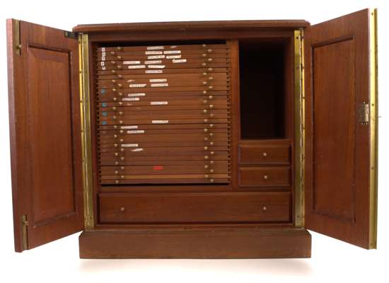 A modern wooden coin cabinet by St Leonards, 45 x 32 x 47cm., comprising 30 trays single-pierced to house a total of 1,2 …