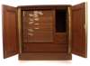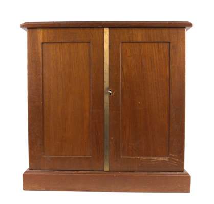 A modern wooden coin cabinet by St Leonards, 45 x 32 x 47cm., comprising 30 trays single-pierced to house a total of 1,207 coins of varying sizes (1x large crown size; 2x crown size; 10x halfpenny size; 17x shilling size), a deep (6cm.) bottom drawer, two additional side drawers and a side receptacle, double brass pulls, double doors, lock and key. A substantial cabinet in almost new condition, complete with all felts and some extras. Pick-up preferred but can be sent at postage cost.
