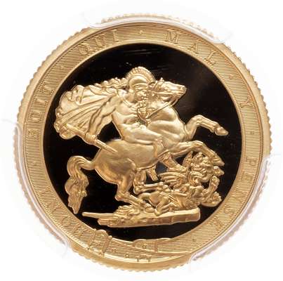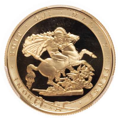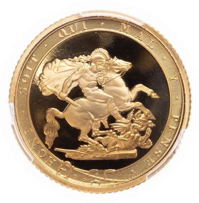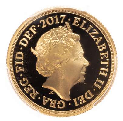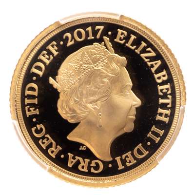 Elizabeth II (1952-2022), Proof Sovereign Five Coin Set, 2017, comprising Five Pound (PR69 DCAM), Two Pound (PR69 DCAM), Sovereign (PR69 DCAM), Half Sovereign (PR69 DCAM) and Quarter Sovereign (PR70 DCAM). Crowned head right, JC initials below, legend surrounding, ELIZABETH II DEI GRA REG FID DEF. Rev, St. George slaying the dragon right, within garter inscribed with motto HONI SOIT QUI MAL Y PENSE, BP initials on ground line below horse (S. PGS81). A highly sought after set commemorating the 200th anniversary of the sovereign, with original Royal Mint case of issue and certificate of authenticity (No. 393 out of only 749 issued). All coins As Struck with a pleasing cameo effect in the fields and housed in PCGS holders.