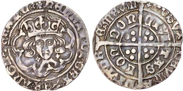 Facing crowned bust in tressure of arches, open crown, fleurs on cusps, fleurs on breast, none above crown, saltires at neck, reading HENRICVS and FR, rev. Long cross with trio of pellets in each angle, saltire stop after POSVI, trefoil after DEVM (Potter and Winstanley die 2, reverse III‑see p.269; N 1703; S 2194). Clipped, otherwise Very Fine / about Very Fine, toned, a scarce obverse legend reading ‑ Potter and Winstanley only knew of 6 coins with the die 2 obverse and class III reverse. SCBI 23/126 has the same reverse as this coin.