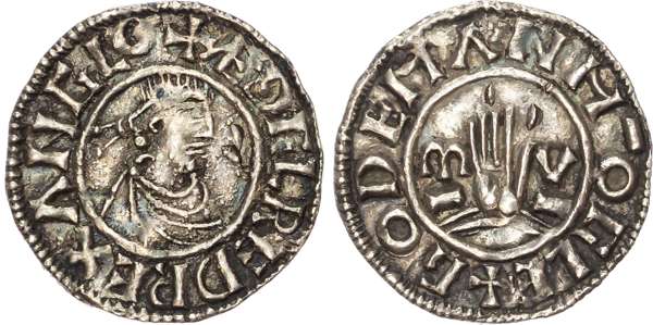 +AEDELRED REX ANGLO, draped and diademed bust right, Rev. +GODEMAN MO GLE, hand of providence reaching down, between alpha and omega sign, 1.66g/6h. (BMC IIa; N. 766; S. 1144). Good Very Fine or better.