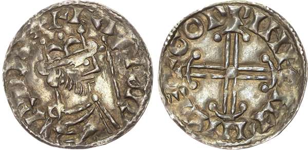 Crowned and draped bust right with sceptre. Rev, short voided cross with hammer head ends, pellet in centre, GODOINE ON PINC, 1.34gm (S. 1182; N. 828). Very Fine or better.