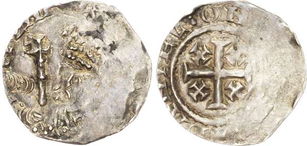 Crowned bust facing with sceptre in right hand. Rev, large cross potent with small potent in each angle, DANIEL : ON [--]B, 1.43gm (S. 1337; N. 952; BMC 699). Very Fine but flat in places, very rare.