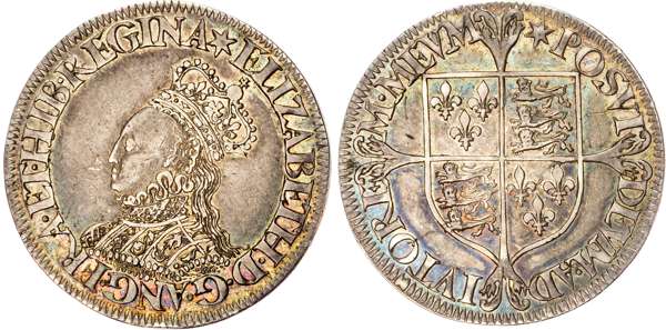 Crowned bust A left, mintmark star both sides, legend reads ELIZABETH D G ANG FRA ET HIB REGINA. Rev, square topped shield over long cross fourchée, legend surrounds POSVI DEVM AD IVTORE M MEVM, 6.18gm (S. 2592; N. 2023). Good Very Fine, pleasing tone.