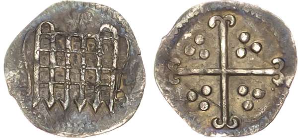 Portcullis. Rev, cross moline, triple pellets in quarters, 0.20gm (S. 2581; N. 2018). Very Fine or better, slightly wavy flan.
