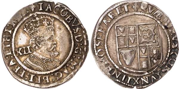King crowned right with longer curly hair, denomination XII, behind, legend surrounds JACOBVS DG MAG BRI FRA ET HI REX, within beaded linear circle. Rev, square topped quartered shield of arms, reads QVAE DEVS CONIVNXIT NEMO SEPARET, 6.00gm (S. 2668; N. 2124). About Very Fine.