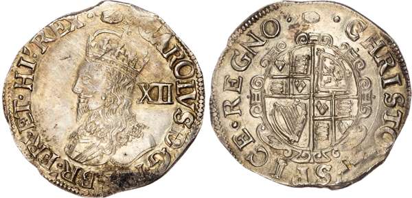 Double arched crown left, value in field behind, legend surrounds CAROLVS DG MA BR FR ET HI REX. Rev, oval shield garnished quartered shield of arms in frame, no CR either side, reads CHRISTO AVSPICE REGNO 6.14gm (S. 2791; N. 2225). Extremely Fine, choice, light tone.