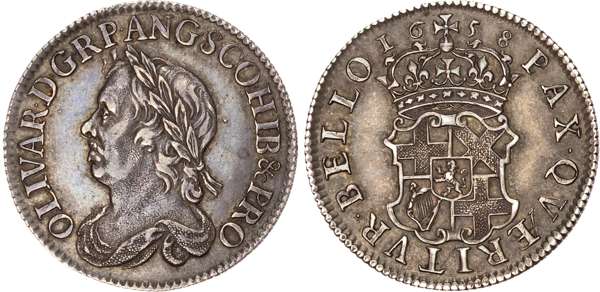 Laureate and draped bust left, OLIVAR . D . G . R . P . ANG . SCO . HIB &c PRO. Rev, crowned shield of the protectorate, PAX QVÆRITVR . BELLO (S. 3228; Bull 254; ESC 1005). Nearly Extremely Fine, toned with underlying mint brilliance.