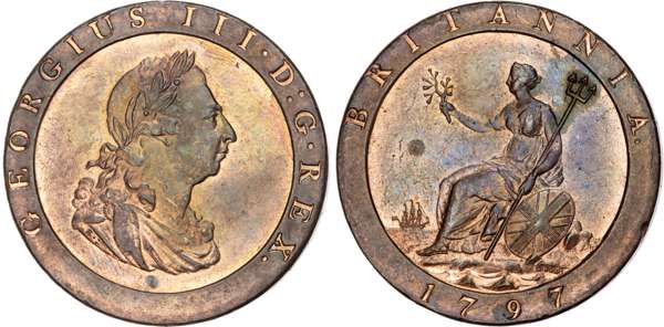 Laureate and draped bust right, K on shoulder, legend incuse on raised rim surrounding on both sides. Rev, Britannia seated left, with olive branch trident and shield, ship sailing right on left horizon, SOHO on rock to right, waves below, date on raised rim below, edge plain (S. 3777; BMC 1132). Some spots of discolouration, otherwise Extremely Fine or better and with much original lustre.