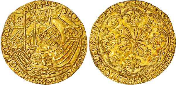 Mintmark long cross fitchee (1469‑70) on rev. only. King armoured with sword and shield standing in ship sailing right, flag at stern, shield with quartered arms of England France, rose on hull. Rev, floriated cross with lis at end of each limb, crowned lion in each angle, within tressure of eight arcs, small trefoils in spandrels, (S. 1951; N. 1549). Encapsulated by PCGS as MS62.