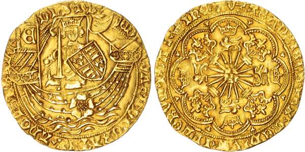 EDWARD DI GRA’ REX ANGL Z FRANC DNS’ IB’, trefoil stops, Edward crowned, facing, on ship, holding sword and shield, rose on hull, banner with E at stern, Rev. IHC AVT TRANSIENS PER MEDIVM ILLORV IBAT, trefoil stops, sixteen rayed sun, rose at centre, ornamental cross terminals ending in lis, crown over lion in each angle, within beaded and linear tressures of eight arcs, trefoils in spandrels, 7.68g, 5h. (N. 1549; S. 1951). Good Very Fine, some weakness to legends. Some minor marks.