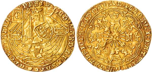 EDWARD DI GRA’ REX ANGL Z FRANC DNS’ IB’, trefoil stops, Edward crowned, facing, on ship, holding sword and shield, rose on hull, banner with E at stern, Rev. IHC AVT TRANSIENS PER MEDIVM ILLORV IBAT, trefoil stops, sixteen rayed sun, rose at centre, ornamental cross terminals ending in lis, crown over lion in each angle, within beaded and linear tressures of eight arcs, trefoils in spandrels, 7.66g, 9h. (N. 1549; S. 1951). Good Very Fine, slight creasing. Scratch to obverse at 2h.