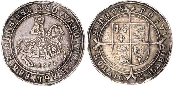 Armoured King with upright sword on horseback right, date 1551 below, linear and beaded circles surrounding, legend surrounds EDWΛRD VI DG ΛGL FRA Z HIBER REX. Rev, long cross fourchée over quartered shield of arms, reads POSVI DEVM Λ DIVTOR E MEV, 30.39gm (S. 2478; N. 1933). Good Very Fine, well struck and nicely toned.