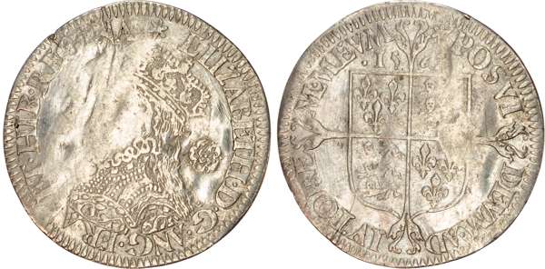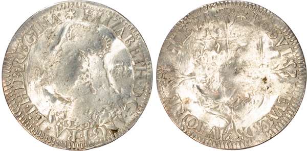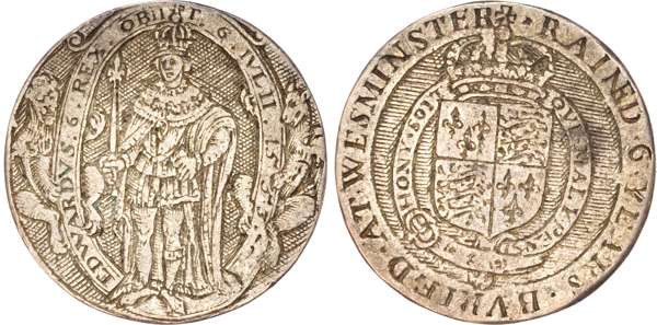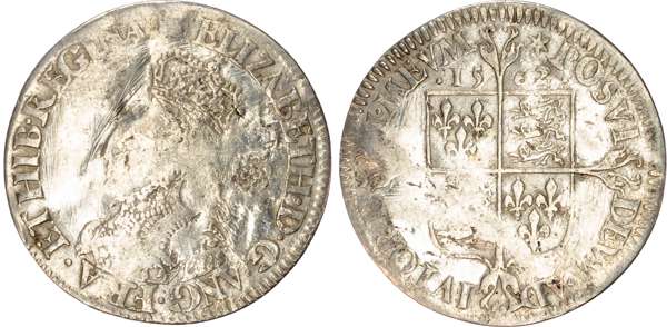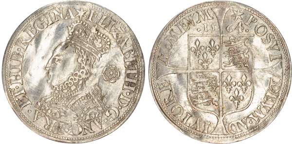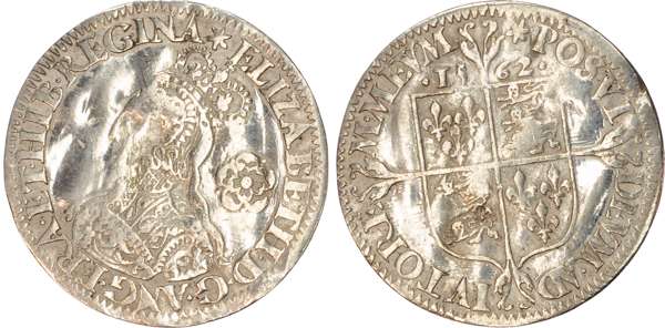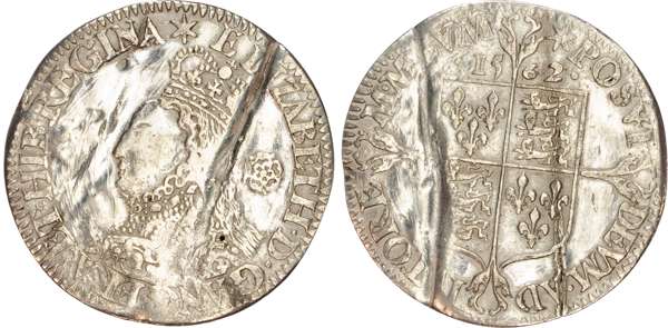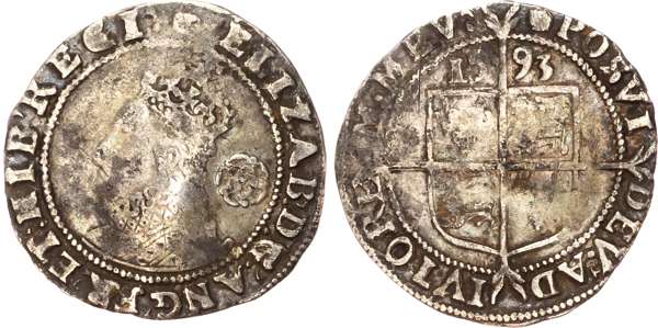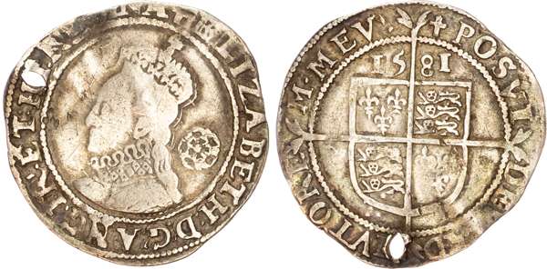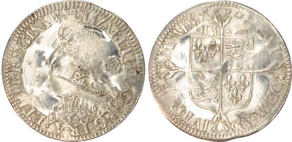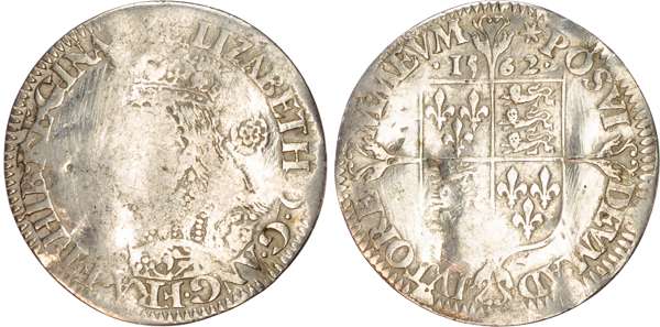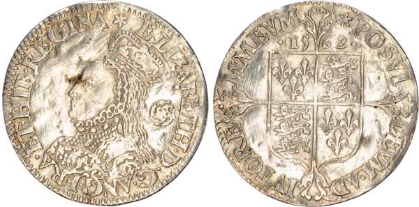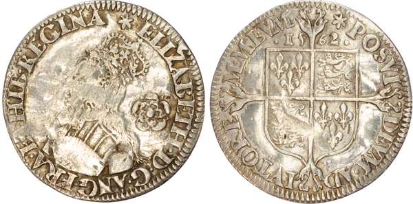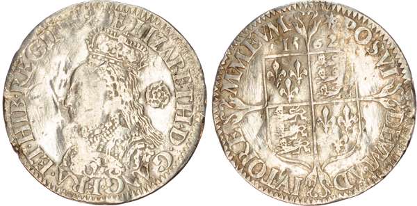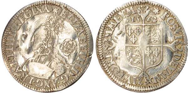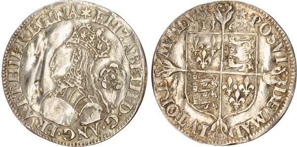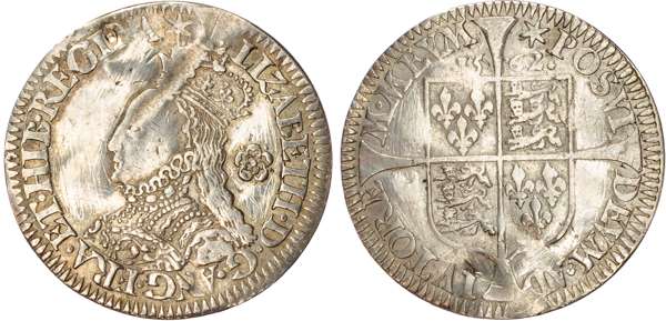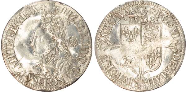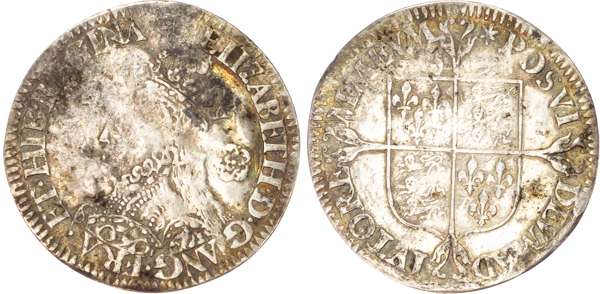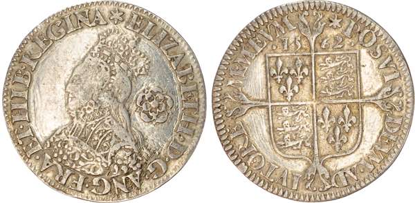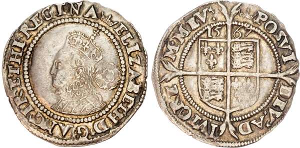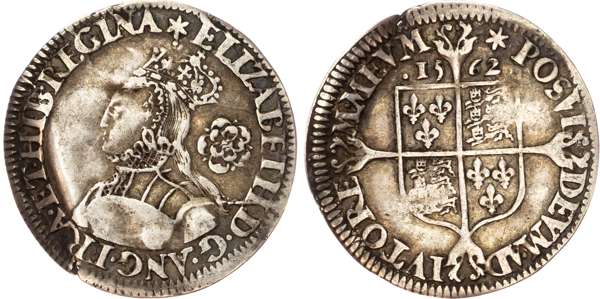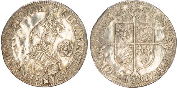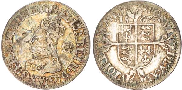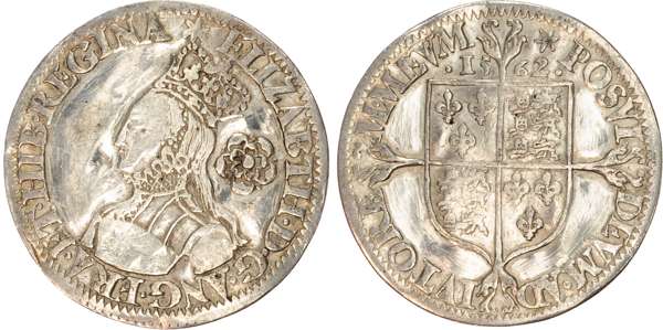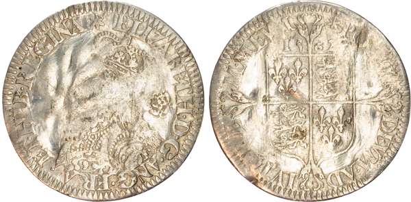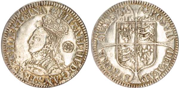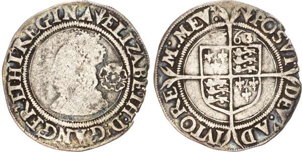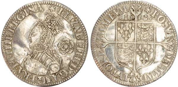 Third and fourth issues, small bust 1F, 1563, mintmark pheon (S. 2561) (1). Intermediate bust 4B, mintmark coronet (1567-70) (S. 2562) (2). Milled coinage, tall narrow bust with plain dress, large rose, 1562, mintmark star (S. 2594) (7). Similar but decorated dress (S. 2595) (2). Large broad bust, elaborately decorated dress, small rose, 1562, mintmark star (S. 2596) (15). Similar but with cross pattée on rev. (S. 2597) (3). Small bust, 1567-68, mintmark lis (S. 2599) (3). Large crude bust breaking legend, 1571, mintmark castle (S. 2600) (1). Fifth issue, 1581, mintmark latin cross (S. 2572) (1). Sixth issue, 1593, mintmark tun (S. 2578B) (1). Edward VI (1547-1553) Memorial, engraved sixpence (26mm/4.50gm). The King standing slightly left holding sceptre, Royal animals either side, in garter, EDWARDVS : 6 : REX . OB[…] . 6 . IVLII . 1553. Rev, royal coat of arms, legend reads RAINED . 6 . YEARS . BVRIED . AT . WESTMINSTER . Varied conditions, Fair to Near Very Fine, milled sixpences all bright, S. 2600 Good Fine and very rare. Housed in an antique silver container with Tudor rose on lid and cross-crosslet coat of arms on compartment. Lot sold as seen, no returns.