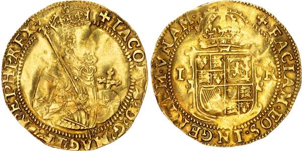 Fifth crowned and armoured bust right holding orb and sceptre, pellet and comma stops reads, IACOBVS DG MAG BRI FR ET HI REX. Rev, crowned quartered shield of arms, I to left, R to right, pellet stops, reads FACIAM EOS IN GENTEM VNAM, 9.98gm (S. 2620; N. 2085; Schneider ‑). A little crimped and with some areas of weakness, otherwise Good Fine to Nearly Very Fine.