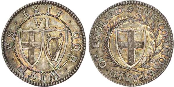 Commonwealth silver Pattern Sixpence, 1651, by T. Simon and P. Blondeau.