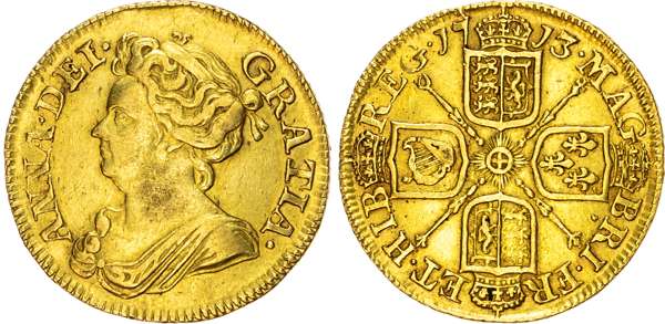 Anne (1702-14), Guinea, 1713, 3 double struck or possibly over 1, draped bust left , rev. crowned cruciform shields, sceptres in angles, six strings to Irish harp, (S. 3574; Bull 477; MCE 225). Good very fine.