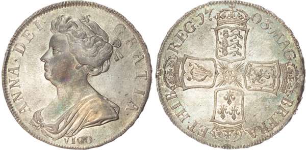 Anne (1702-14), Halfcrown, 1703, draped bust left, VIGO below, reverse crowned cruciform shields (S.3580, Bull 1358, ESC 569). About extremely fine, the reverse better, attractively toned.