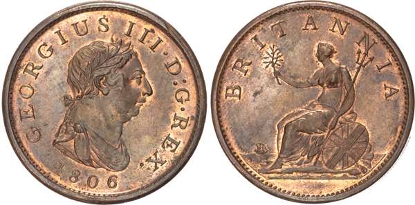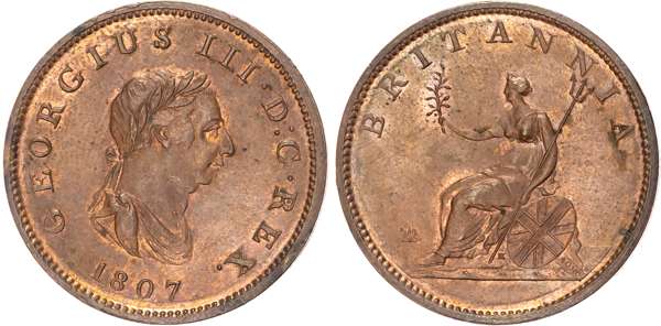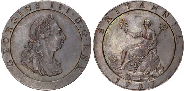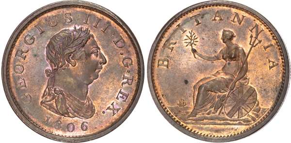 ‘Cartwheel’ Penny, 1797 (S. 3777), Penny, 1806 (2) (S. 3780), Halfpenny, 1770 (2) (S. 3774), Halfpenny, 1807 (S. 3781). Varied conditions, Extremely Fine to practically As Struck, some lustrous, a very pleasing group. Lot sold as seen, no returns.