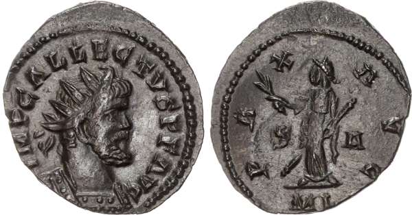 IMP C ALLECTVS P F AVG, radiate, draped and cuirassed bust of Allectus right. Rev. PAX AVG, Pax standing left, holding branch and transverse sceptre, ML in exergue. (RIC 33). Extremely Fine.