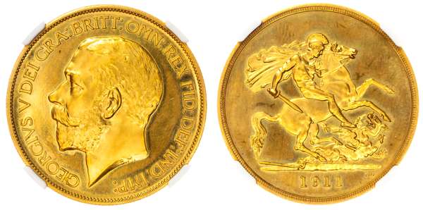 George V (1910-1936), AV Proof Five Pounds, 1911. NGC PF63.