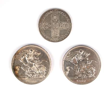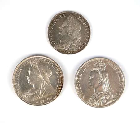 Comprising George II (1727-1760) Halfcrown; George III (1760-1820) Halfcrowns (2), Shilling, Sixpence, Threepence; Victoria (1837-1901) Crowns (3), Double Florin, Halfcrowns (2), Sixpence; Edward VII (1901-1910) Crown, Halfcrown; George V (1910-1936) Florins (5), Sixpences (2); George VI (1936-1952) Florins (19) Sixpences (12). Varied conditions, Very Fine to practically As Struck, Edward VII Crown Extremely Fine. Viewing recommended, lot sold as seen, no returns.