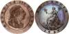 Draped bust right, wreath of 10 leaves and 4 berries, the last one small, k : · on lowest fold of drapery, brooch of 6 jewels, stops in legend partially blocked up, rev. Britannia seated left on rock above three rows of waves, small patch of sea behind, olive branch with 11 leaves, soho · and incuse triangle of dots on rock at right, edge plain, (BMC 1068 [KT 2]; S.3776). Pleasing as struck, minutest of hairlines, attractive bluey tone on reverse. Very rare.