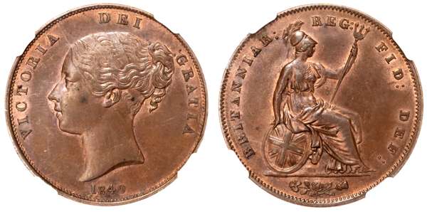 Young head left, rev. Britannia seated right, with ornamental trident, (BMC.1497; S.3948). Uncirculated with some red lustre on both sides. Encapsulated by NGC as MS62 BN.