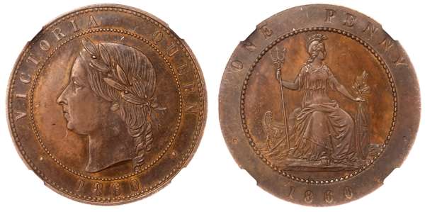 Laureate bust left, rev. Britannia seated in ship’s prow, legend above date, 1860, below (incuse), on a broad raised rim, edge plain, (F 846, dies 1/C; BMC 2119). Encapsulated by NGC as MS64 BN.
