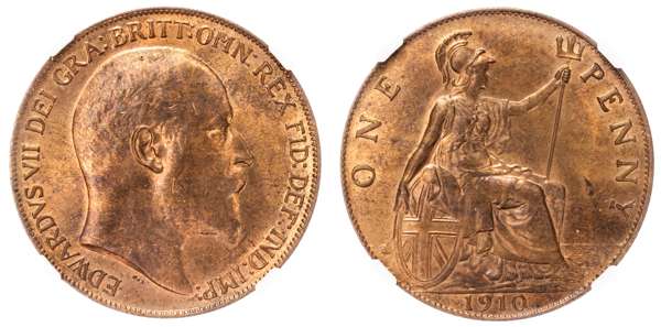 Barehead right, rev. Britannia seated with shield and trident, (Fr.170, dies 2+E; BMC.2219; S.3990). Virtually full red mint lustre. Encapsulated by NGC as MS64 RB.