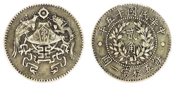 China, Republic, Dragon and Phoenix silver 20 Cents, 1926, year 15, Tientsin mint, dragon and phoenix atop symbol of longevity. Rev. Denomination in wreath (LM 82; KM Y-335; K. 681). In PCGS holder graded XF 45 (54860188).