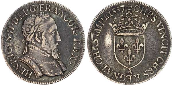 France, Henri II (1547-1559), silver Teston au buste lauré du molin, early milled issue made in Moulin des Étuves, 1557/5 A, Paris, 4th type, 9.46g (C. 1285; Dy. 990). Good Very Fine, rare. Overdate variety, deep cabinet tone. We have not handled an overdate variety of this coin before.