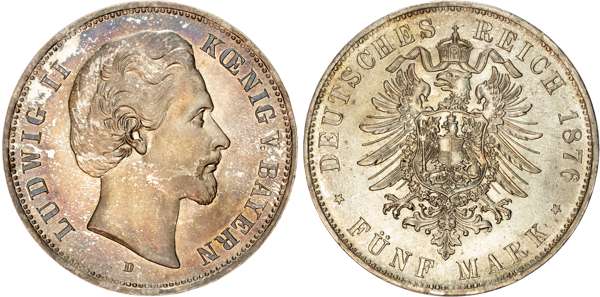Germany, Bavaria, Ludwig II (1864-1886), silver 5 Mark, 1876 D