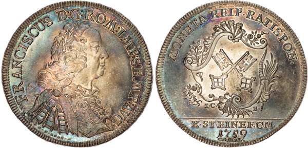 Germany, Regensburg, silver Taler, in the name of Francis I, 1759, ICB - Johann Christoph Busch mintmaster, 28.14g (Dav. 2619). Uncirculated, retoned.