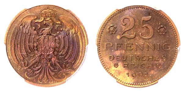 Germany, Empire, Wilhelm II (1888-1918), copper Specimen Pattern 25 Pfennig, 1908 D, Munich mint, by Karl Goetz (Sch. 18/G27). In PCGS holder graded SP 66 Red Brown (55430639). The finest known in PCGS census.