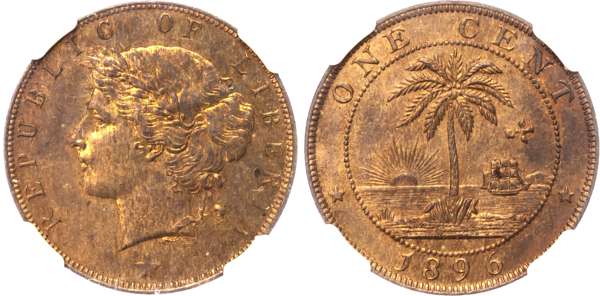 Liberia, Republic, copper Cent, 1896 H (KM 5). In NGC holder graded MS 63 RB (3884087-007).