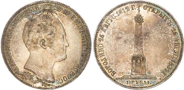 This Rouble was struck to commemorate the unveiling of the Battle of Borodino monument. The battle happened during Napoleonic invasion and allowed the French to take Moscow and advance. The Russians suffered about 45,000 casualties. Although badly hurt, the Russian army eventually drove Napoleon out of Russia. This is one of the most popular commemorative coins from the reign of Nicholas I.