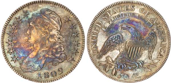 USA, Capped Bust, silver Half Dollar, 1809, normal edge, 13.41g (KM 37). Good Very Fine to About Extremely Fine. Artificial toning.