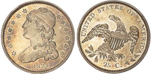 USA, Capped Bust, silver 25 Cents, 1834, Philadelphia, 6.74g (Yeo. 2016; S. 166). Uncirculated, underlying lustre.