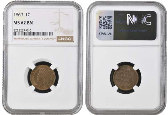 USA, Indian Head bronze Cent, 1869, Philadelphia, 3.00g (KM 90a). In NGC holder graded MS 62 BN (8222227-010).
