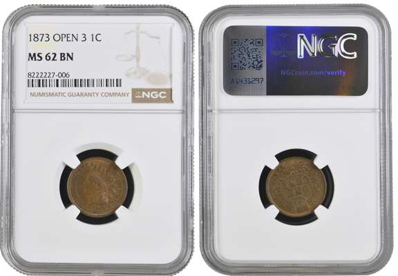 USA, Indian Head bronze Cent, 1873, open 3 variety, Philadelphia, 3.00g (KM 90a). In NGC holder graded MS 62 BN (8222227-006).